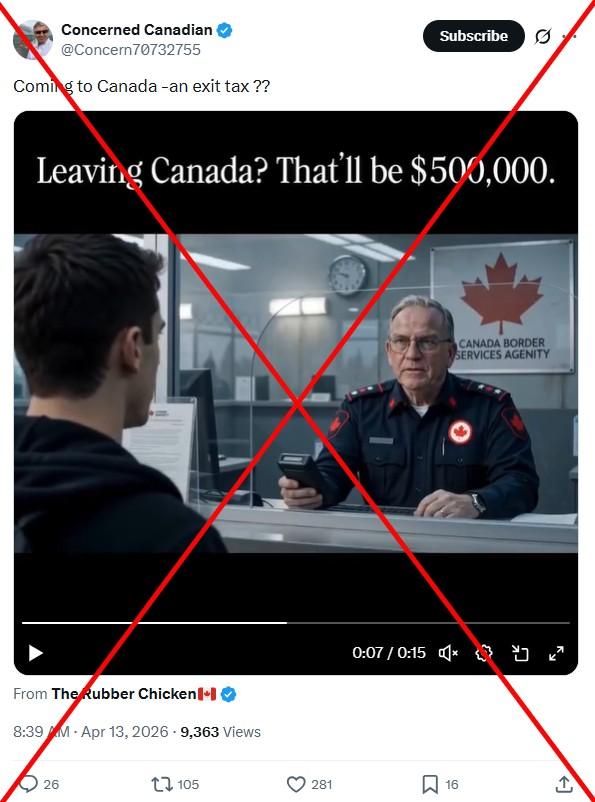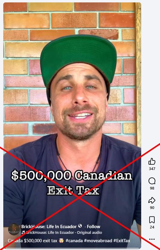 "Canada is going to charge a half a million dollar exit tax," says the speaker in an April 14, 2026 Facebook video, whose account promotes his lifestyle as a Canadian living abroad.