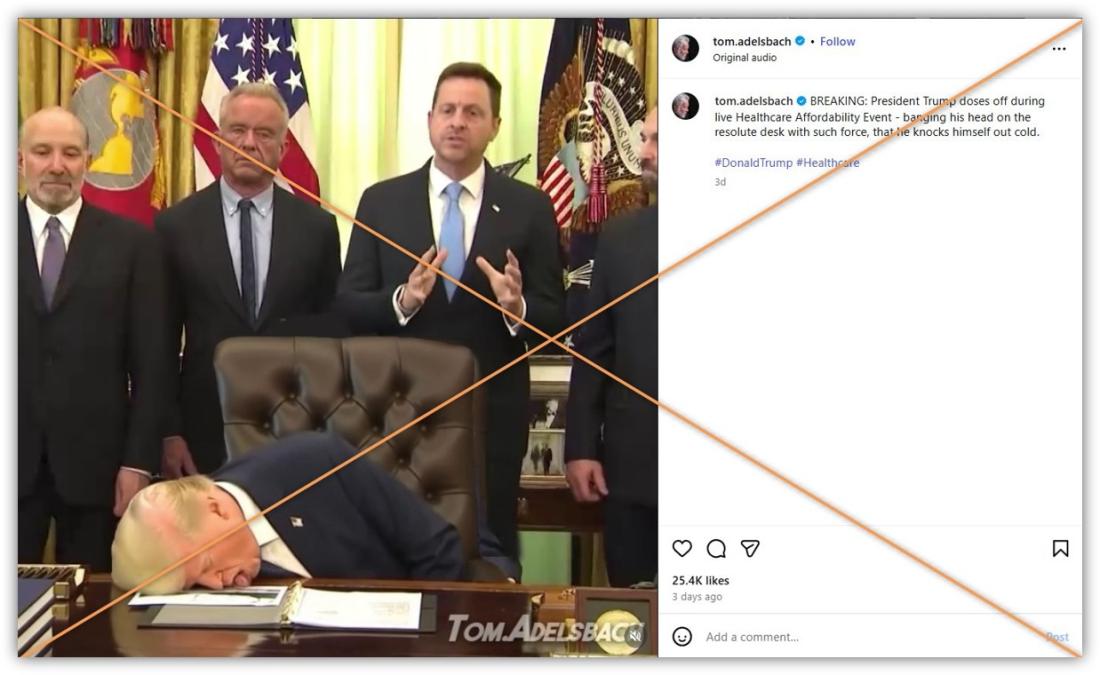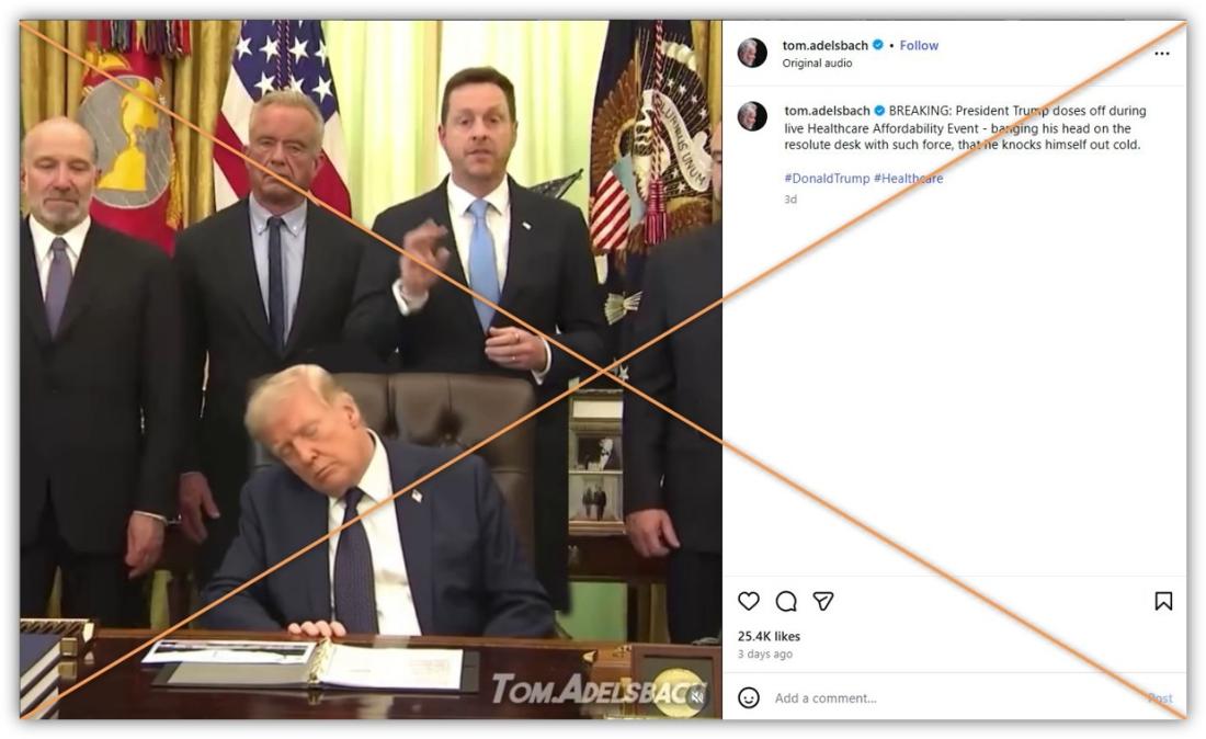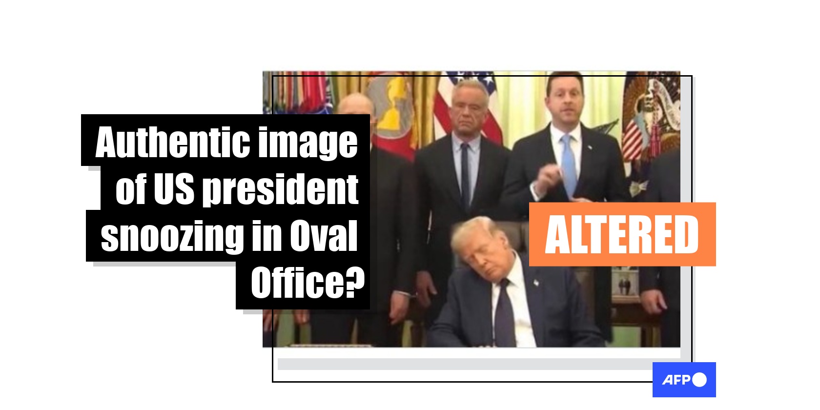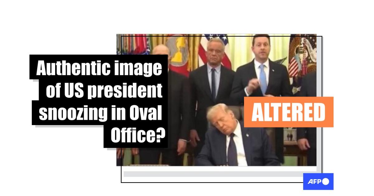 An image rocketing across social media purports to show Donald Trump knocked out asleep during an April 23, 2026 event in the Oval Office of the White House. But while official, livestreamed footage from the health care event showed the US president closing his eyes at various points, the picture making the rounds online comes from a doctored video that was created by a graphic artist who says his fakes are parody.