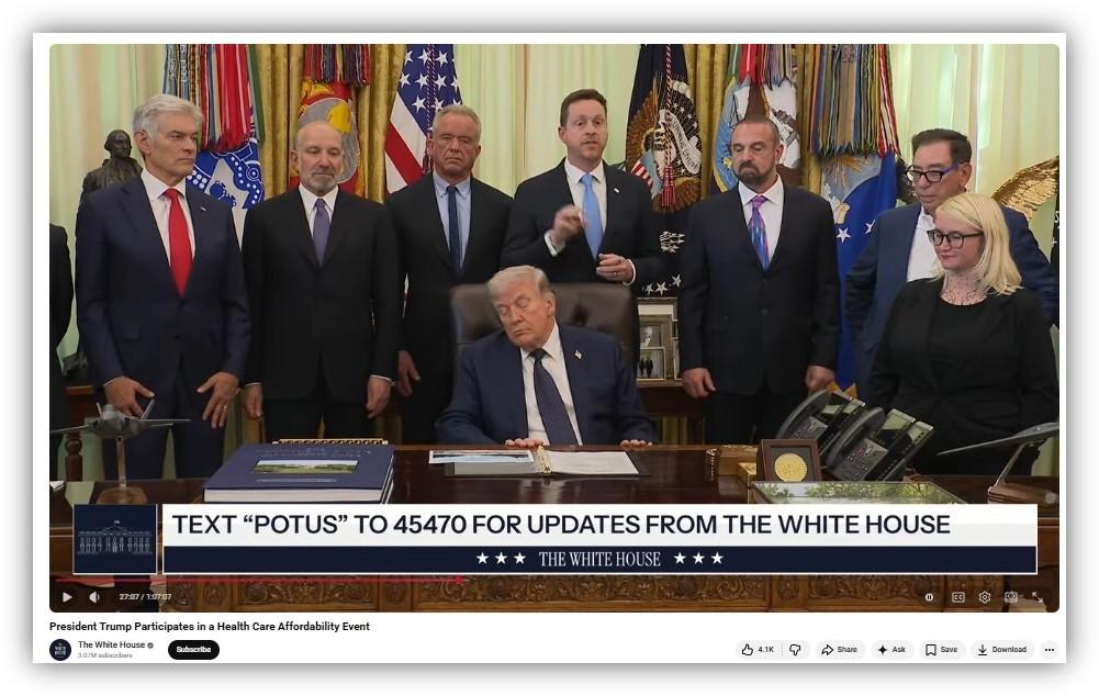 The White House's official livestream of the event shows the moment that Adelsbach altered, in which Chris Klomp, director of the Center for Medicare, was speaking from behind Trump and gesturing with three fingers up on his right hand (archived here). In the genuine footage, Trump was leaning slightly to one side and looking down at the papers on his desk.