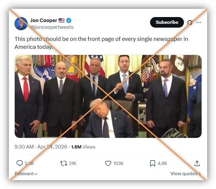 "This photo should be on the front page of every single newspaper in America today," liberal commentator Jon Cooper wrote April 24, 2026 in posts sharing the image to X, Threads and Bluesky.