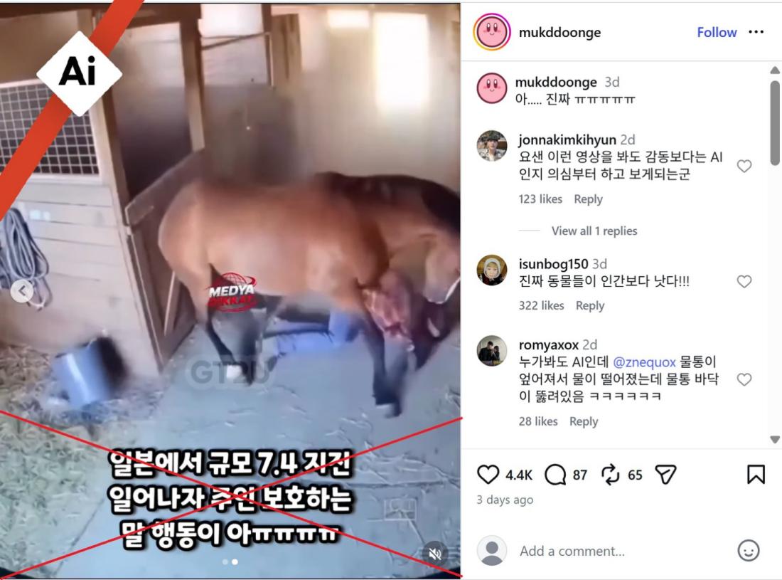 "Horse protects its owner when a 7.4 earthquake hit Japan," reads Korean-language text over a video shared on Instagram on April 24, 2026.