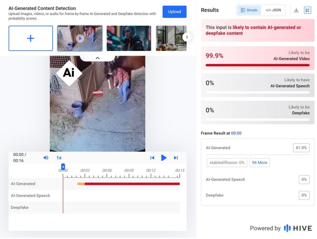 An analysis using the Hive Moderation AI detection tool found the video is 99.9 percent "likely to contain AI-generated or deepfake content" (archived link).