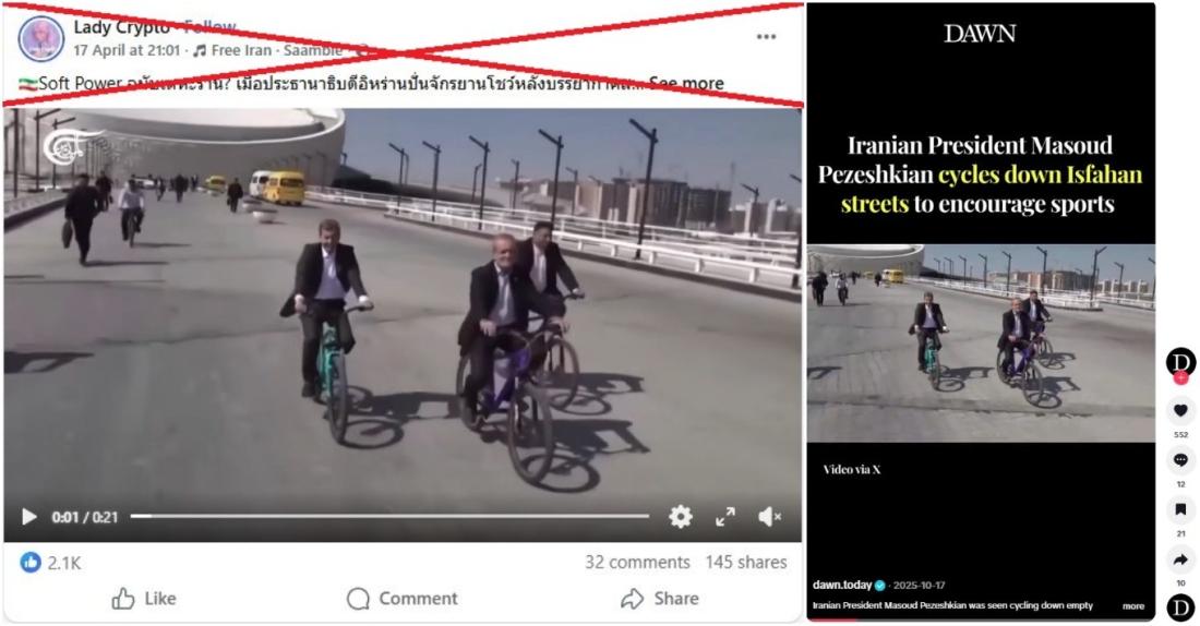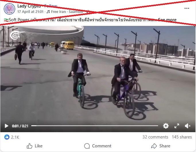 "Tehran's take on soft power? The Iranian President is seen cycling as the war tensions begin to ease," reads in part a Thai-language Facebook post shared on April 17, 2026.