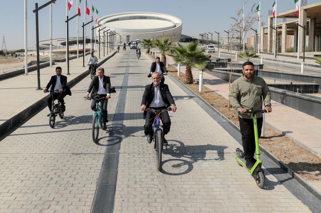 AFP also distributed the photos of Pezeshkian cycling with description saying the handout photos capture the Iranian president on October 16, 2025, riding a bicycle alongside local officials during a visit to Isfahan, with the aim of promoting sports and a healthy lifestyle.