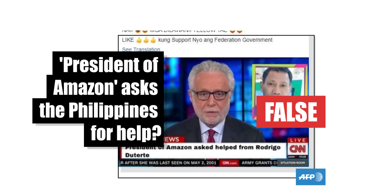 The doctored image of a CNN report was published here in a Facebook post on August 27, 2019. It contains a purported screenshot of a CNN broadcast hosted by anchor Wolf Blitzer which combines a supposed photo of Duterte with a Breaking News ticker saying: “President of Amazon asked help from Rodrigo Duterte”.
