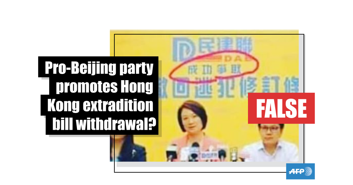 This is a doctored photo of a pro-Beijing party in Hong Kong which includes a message supporting the extradition bill’s withdrawal
