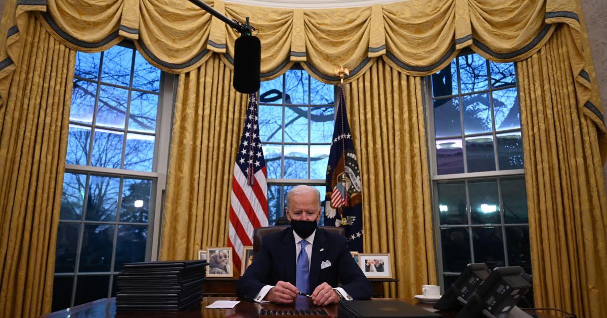 The AP’s photo caption reads: “President Joe Biden pauses as he signs his first executive orders in the Oval Office of the White House on Wednesday, Jan. 20, 2021, in Washington”.