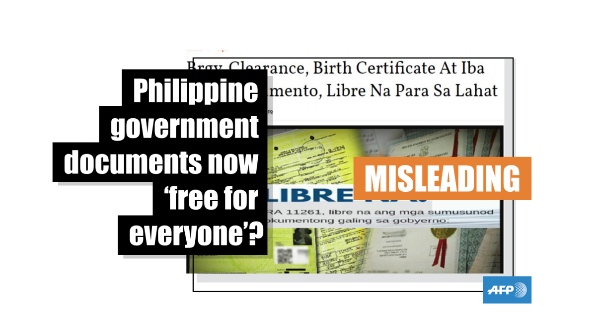 Translated to English, the Tagalog-language text superimposed on a photo showing several government documents states: “ALREADY FREE! Under RA 11261, the following documents from the government are now free”.