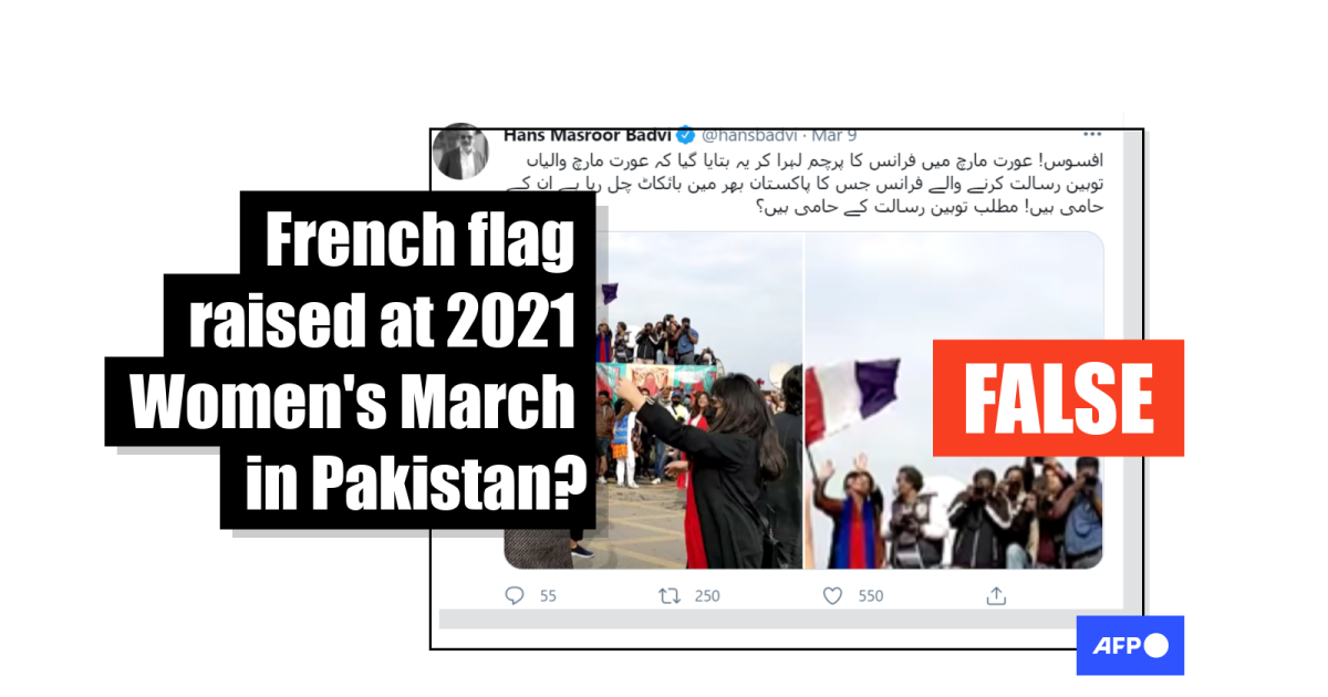 Other posts making the claim that the French flag was raised at an Aurat March in Pakistan have been shared hundreds of times after appearing on Facebook here, here, here, here, here, here and here; and on Twitter here, here, here, here and here.