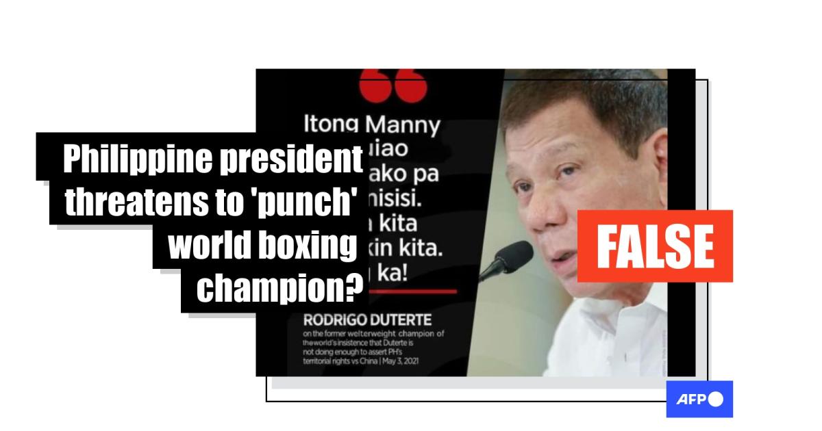 However, the claim is false. The graphic has been doctored to include Pacquiao’s name in comments Duterte made about former diplomat Albert del Rosario.