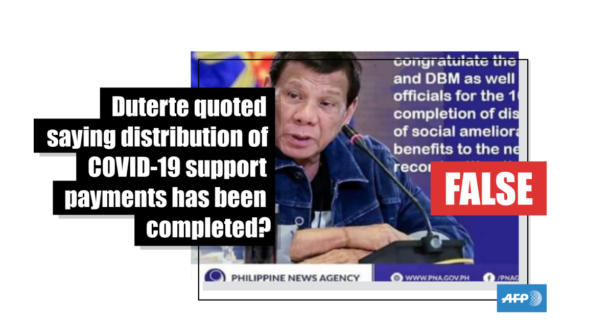 "The Philippine News Agency clarifies that such quote card of President Duterte congratulating the DSWD, DBM, and local officials for the supposed 100 percent completion of the distribution of social amelioration benefits was never published. It was maliciously culled from a quote card posted on its Facebook page on April 4, 2020,” the statement read.
