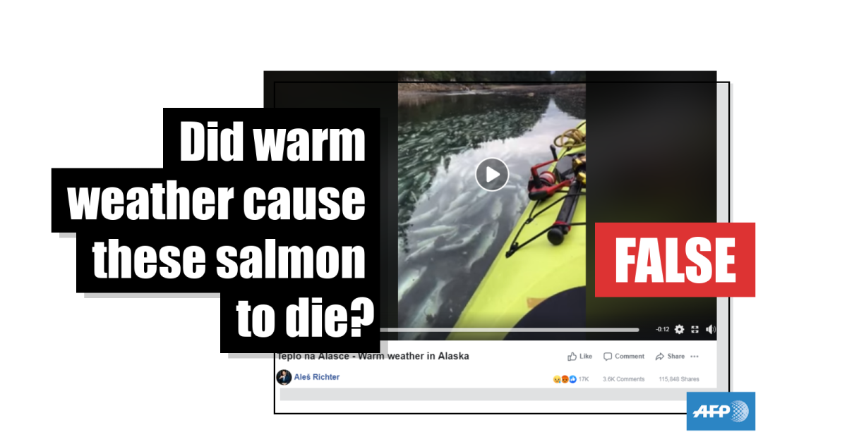 Although the video is real and the context is correct, these Pacific salmons were not killed by warm weather.