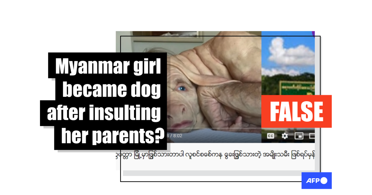 The Burmese-language title of the video translates in English as: “It happened in Labutta. The true story of a woman who turned from a real person into a dog.”