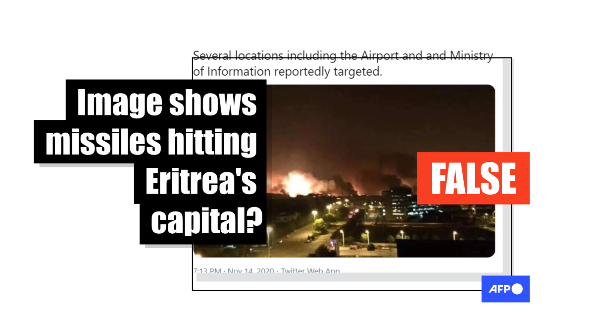 The image was used in a November 14, 2020 tweet shared more than 260 times which read: “BREAKING: 3 missiles hit #Eritrea capital, #Asmara, hours after senior #TPLF official threatened to strike the country’s cities including #Massawa & #Asmara. Several locations including the Airport and and Ministry of Information reportedly targeted (sic).”