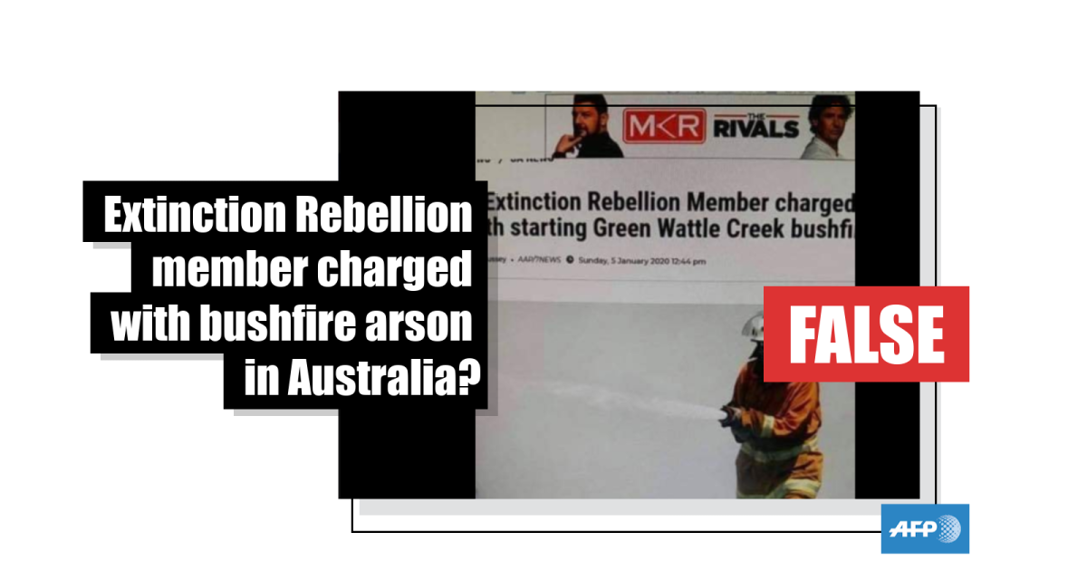 It shows a screenshot of a cropped online news article with the headline: “Extinction Rebellion member charged with starting Green Wattle Creek bushfire”.