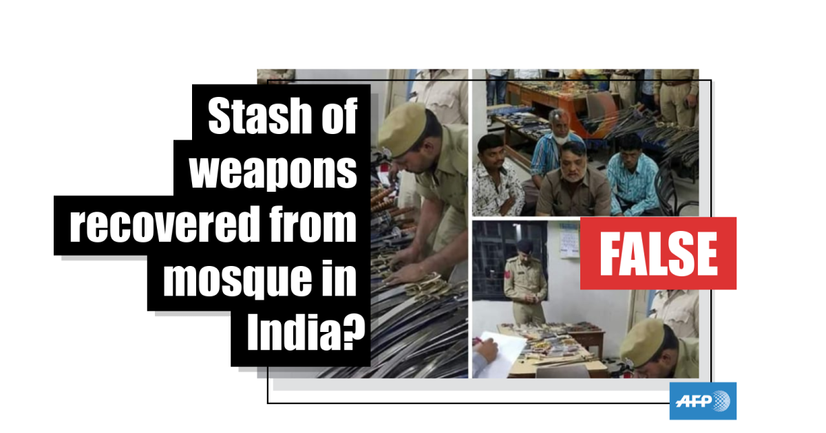 The claim is false. Police told AFP the weapons were confiscated from a hotel, not a mosque.