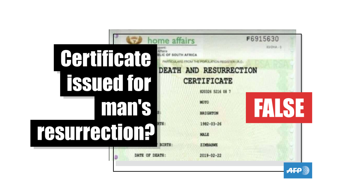 This post here was shared more than 400 times on Facebook and, like others here, here and here, includes an image of what looks like an official “Death and Resurrection Certificate” issued by South Africa’s Department of Home Affairs.