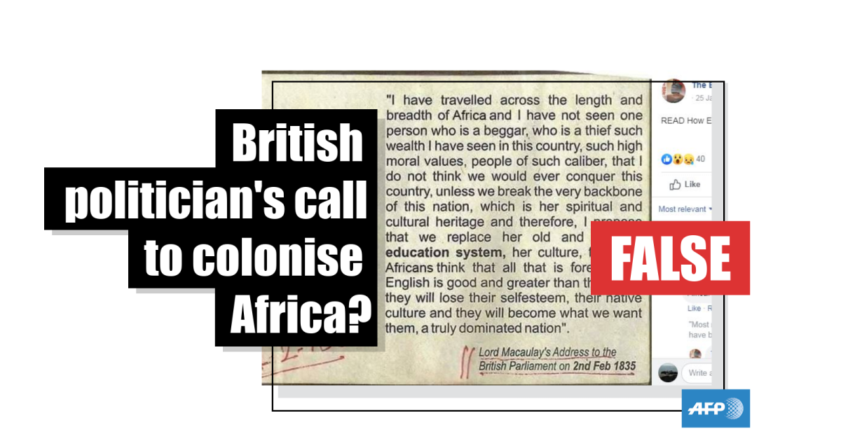 A speech calling on Britain to break the very backbone of Africa has circulated online for years. The words are attributed to politician Lord Macaulay in an address to Britain's parliament in 1835. However, there are no records of the speech and Macaulay was in India the day it was allegedly given.