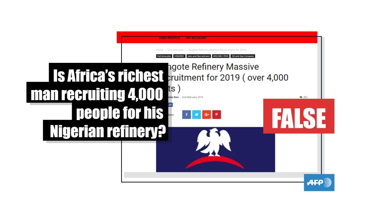 There are no posts currently listed under “refinery” on the conglomerate’s website and Anthony Chiejina, head of corporate communications for the Dangote Group, told AFP that the recruitment claim should be disregarded.
