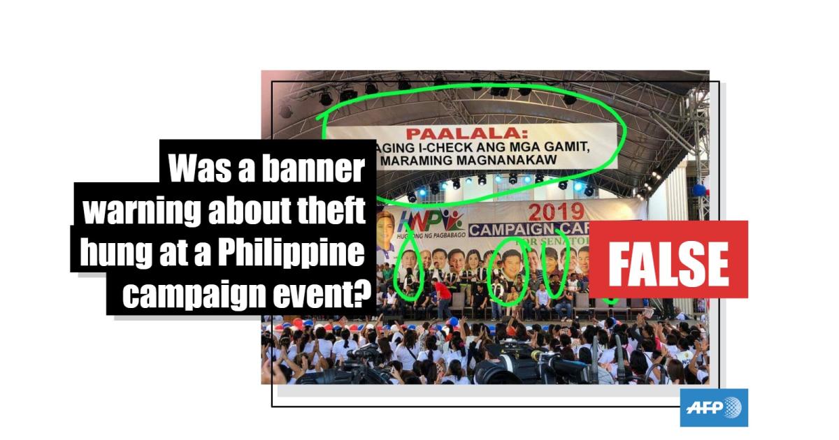 No, a banner saying “belongings should be checked because there are many thieves” was not hung at this campaign event for Philippine senatorial candidates