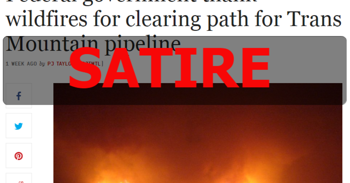 The Beaverton, a Canadian satirical media site that also broadcasts on a TV comedy channel, reported on August 22 that the summer wildfires in British Columbia had been praised by several members of the government and oil company executives for the money they would save in the building of the Trans Mountain Pipeline.