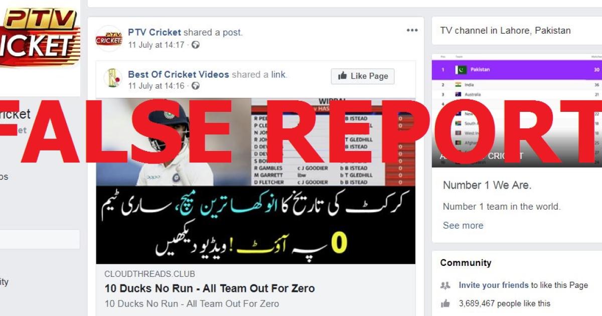 An English translation of the Urdu post underneath the scorecard in the pages reads: “Unprecedented match in the history of cricket, the entire team was out for zero. Watch the video.”