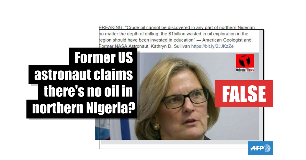 The Oriental Times, a website which has shared false information numerous times in the past, posted a picture of Sullivan on Facebook with the caption: “BREAKING: ‘Crude oil cannot be discovered in any part of northern Nigerian no matter the depth of drilling, the $1billion wasted in oil exploration in the region should have been invested in education’ — American Geologist and Former NASA Astronaut, Kathryn D. Sullivan”.