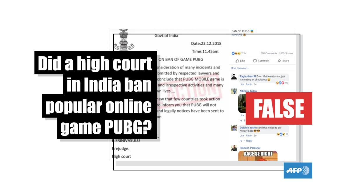 Multiple Facebook posts, for example this one which has been shared hundreds of times since it was published December 23, 2018, claim that online multiplayer battle royale game PlayerUnknown's BattleGrounds, widely known as PUBG, has been banned by an Indian court.
