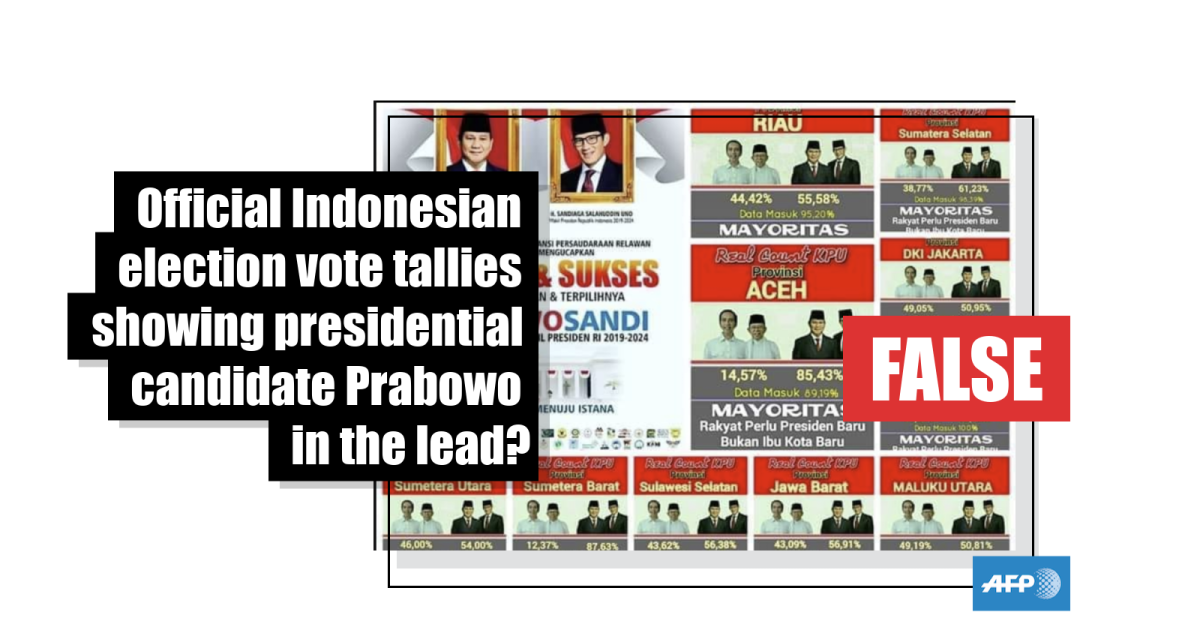 Below is a table created by a journalist in AFP's Jakarta bureau which shows the purported election results shown in the misleading infographic: