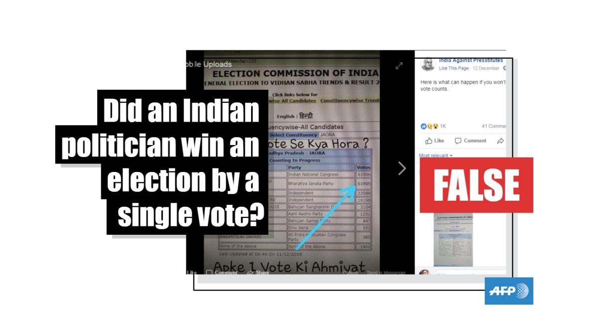 The photograph, which has been shared hundreds of times since it was posted to Facebook December 12, is a screenshot of an official vote tally for candidates in the Jaora constituency in the central Indian state of Madhya Pradesh in recent elections.