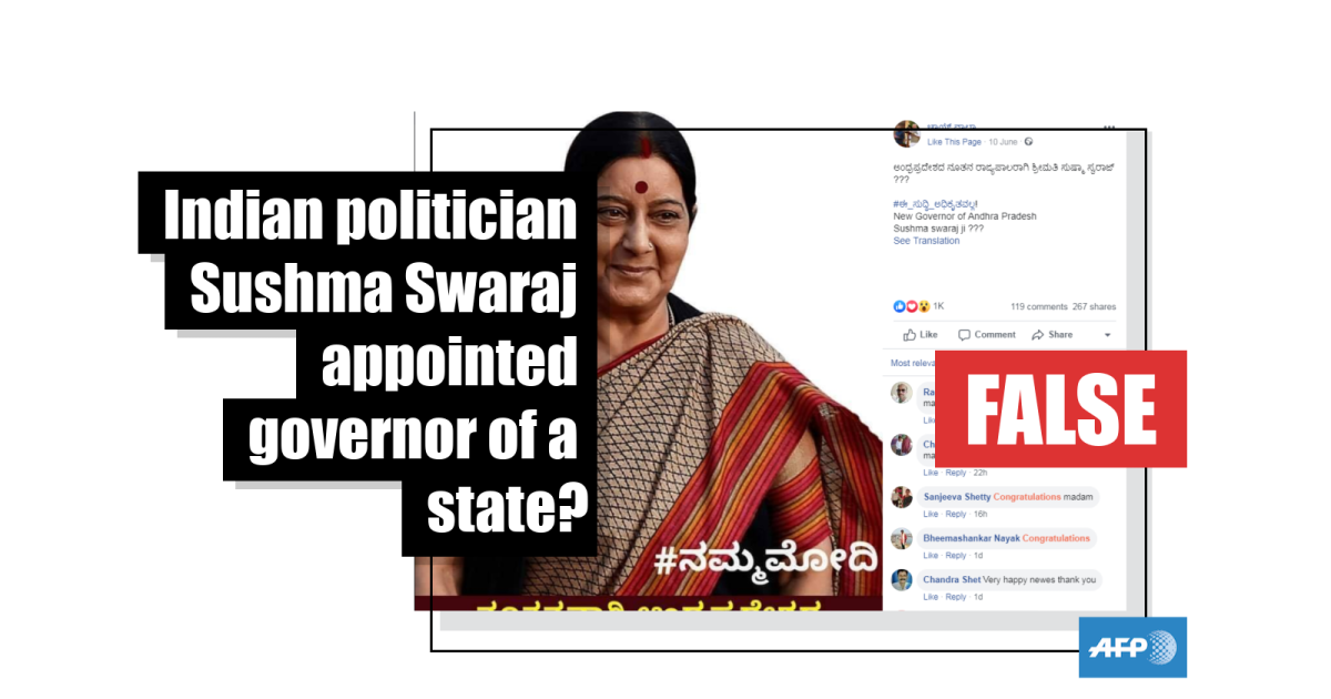 Multiple posts, including this one which has been shared more than 270 times since it was published to Facebook on June 10, 2019, claim that Swaraj has been appointed the governor of Andhra Pradesh.