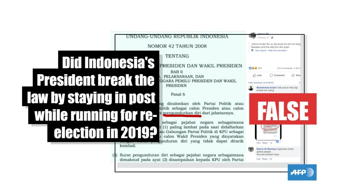 On September 13, 2018, AFP debunked an almost identical claim which said that Widodo had to step down as president before running for re-election according to a 2008 version of the campaign law.
