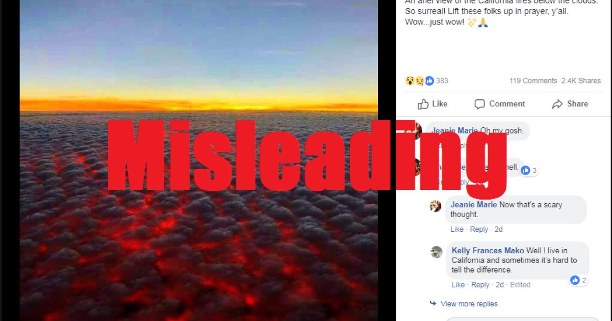 According to many users who shared it, this photo is an aerial view of a cloud formation above California, which is currently fighting the most devastating fires in its history.
