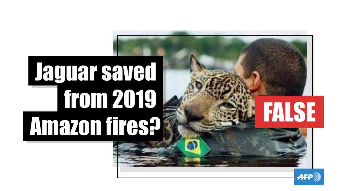 The photo was shared with various claims about the Amazon fires in English, Spanish and French. One of the English posts says: “Such a poignant picture which tells a thousand stories...A Jaguar, exhausted by trying to escape the raging fires in the Amazon is rescued by a human - the very species which is wrecking it’s environment and the world at large...at an alarming rate.”