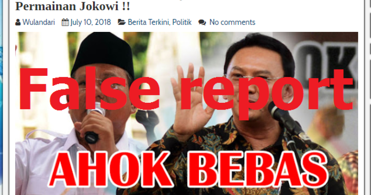An English translation of the article in Beritanewsupdate.pw, published on Facebook on July 10, 2018, reads: “Viral. A Video of Ahok being released on parole. Prabowo: this must be a Jokowi plot!!” It also carries the sub-headline in red lettering “Ahok is free”.