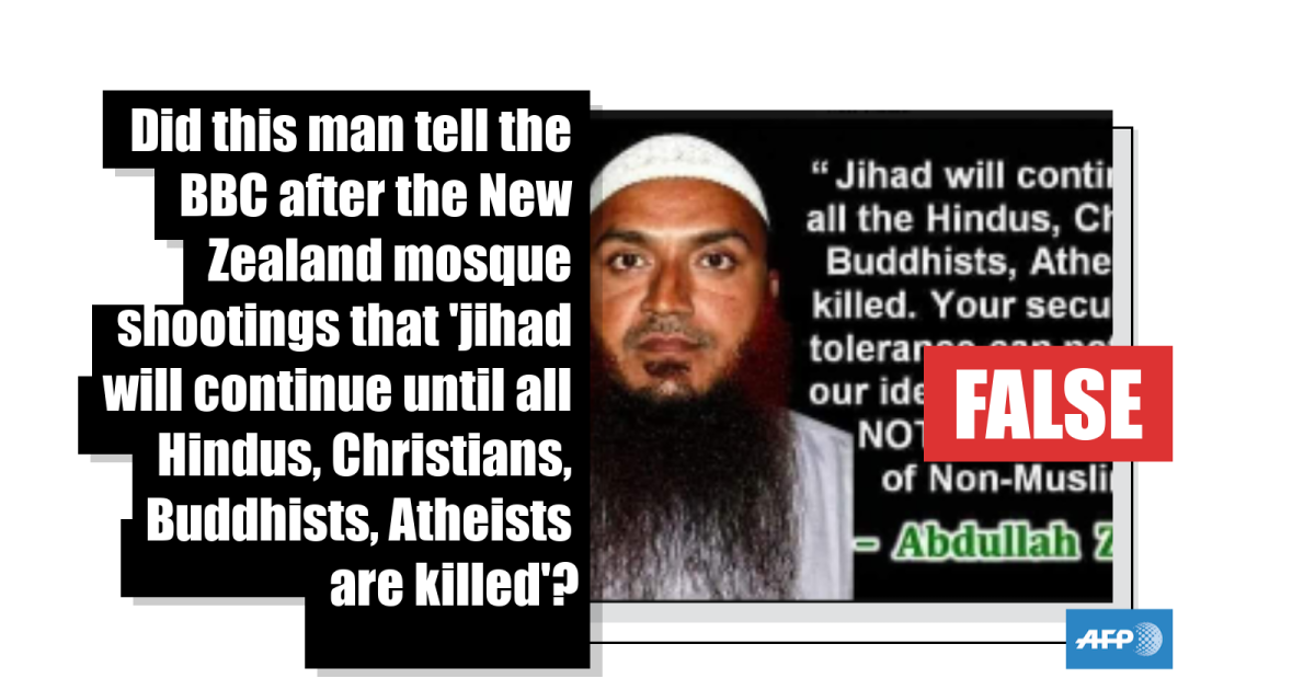 No, this man did not tell the BBC after the New Zealand mosque shootings that ‘jihad will continue until all Hindus, Christians, Buddhists, Atheists are killed’