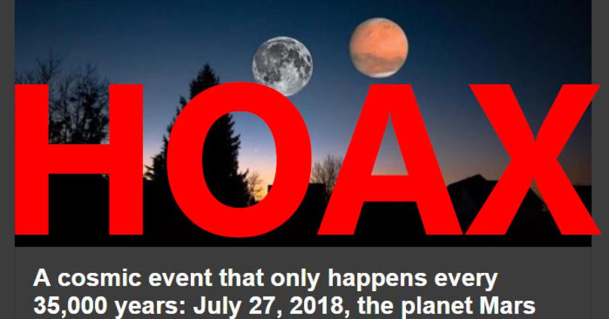 With more than 65,000 shares in just two days, this article from ScienceInfo is popular all over the world. According to the hoax, Mars will appear as big as the Moon on July 27, 2018, and this is "a cosmic event that only happens every 35,000 years."