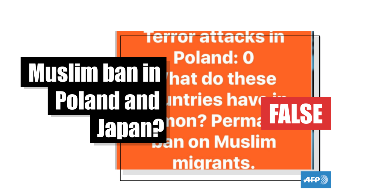“Terror attacks in Japan: 0. Terror attacks in Poland: 0, What do these countries have in common? Permanent ban on Muslim migrants.” These words, printed in white font over a plain orange background, were shared at least 54,000 times since their publication in a Facebook post on May 9, 2019.
