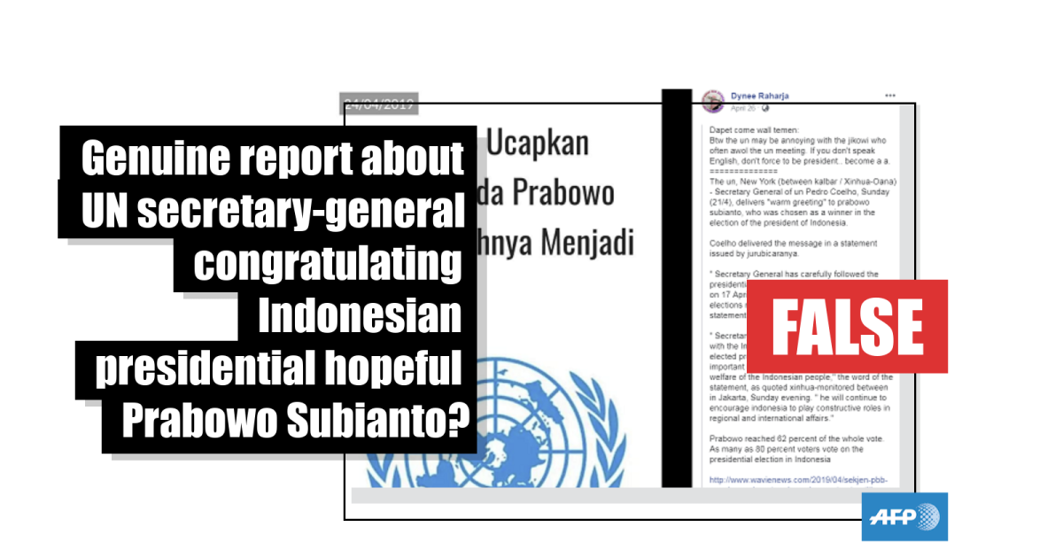 No, this is not a genuine report about the UN secretary-general congratulating Indonesian presidential hopeful Prabowo Subianto
