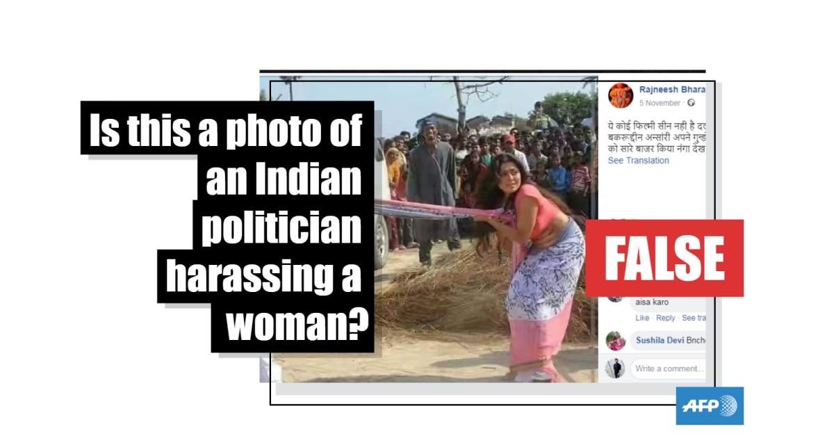 The photograph, shared on Facebook on November 5, purports to show the man pulling the woman's clothes. Accompanying text falsely claims the man has a Muslim name and is a leader of a local political party.