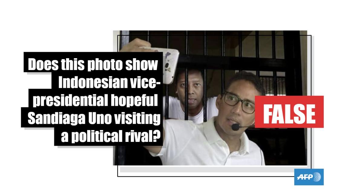 Multiple Facebook posts, for example this one published March 22, 2019, and shared more than 4,400 times since, contain a photo that purports to show Uno taking a selfie with a man behind bars who resembles Indonesian politician Muhammad Romahurmuziy.