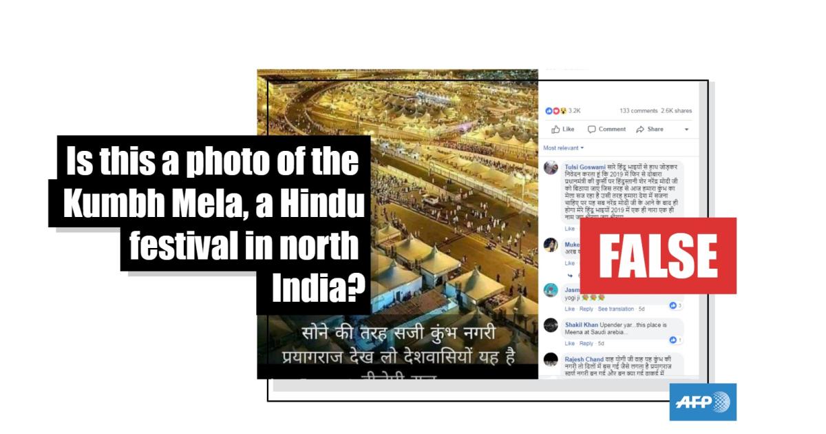 Here is an AFP photo taken at Prayagraj on January 9, 2019, one week before the commencement of the Kumbh Mela. The tents in the photos below are not conical in shape, and many tents are multicolored, unlike those in Mina which are entirely white.