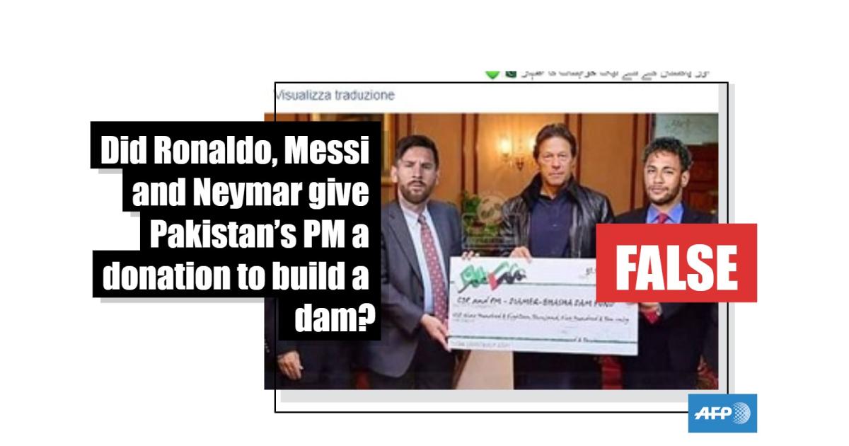 No, this is not a photo of Ronaldo, Messi and Neymar giving Pakistan’s Prime Minister Imran Khan a donation to build a dam