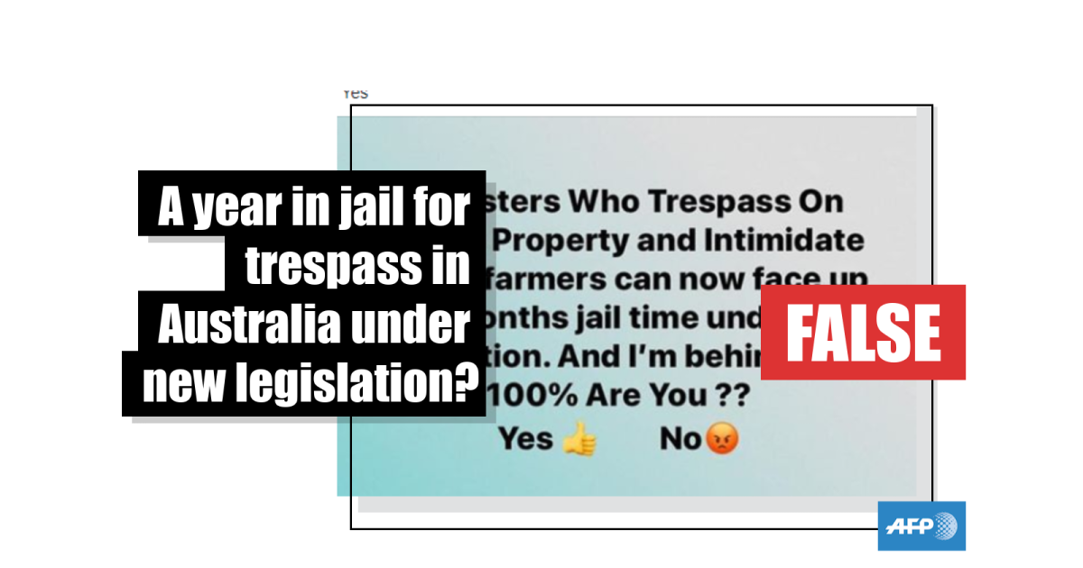 No, people who trespass, intimidate farmers in Australia do not face up to 12 months in jail under new legislation