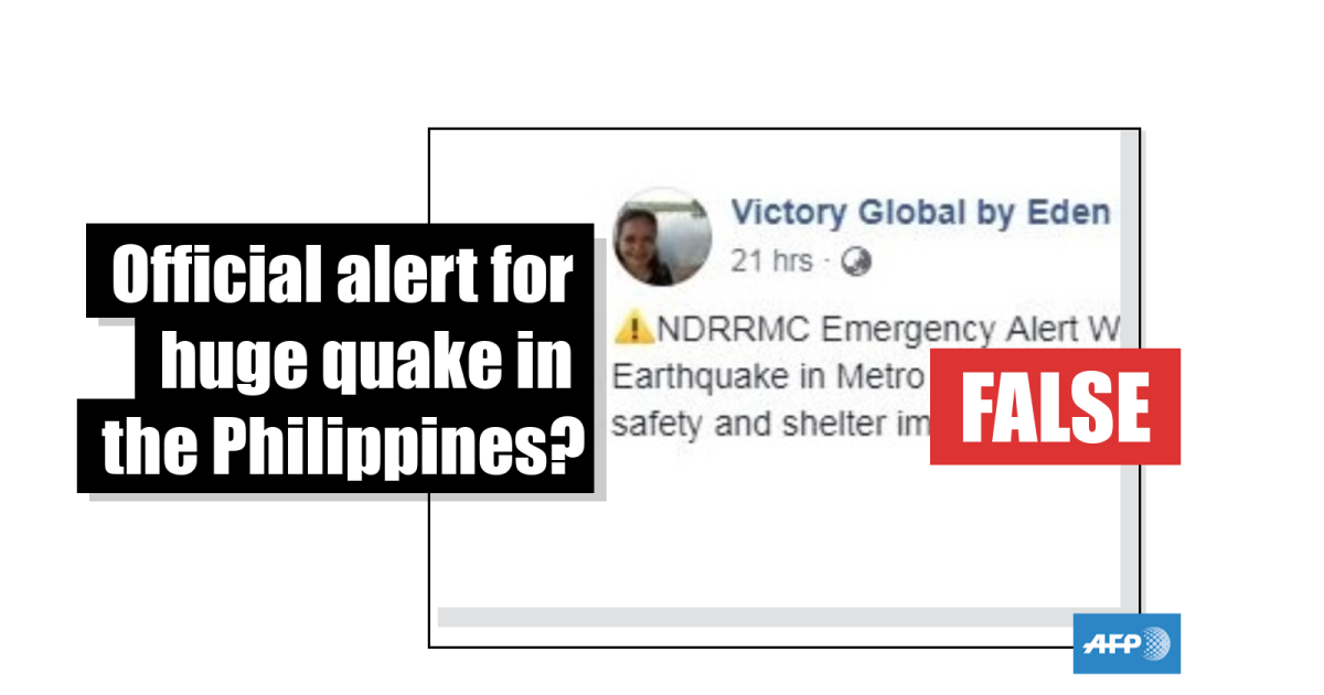 The posts say: “NDRRMC Emergency Alert Warning! Expect a magnitude 8+ Super Earthquake in Metro Manila and nearby towns within the next hour. Seek safety and shelter immediately.”