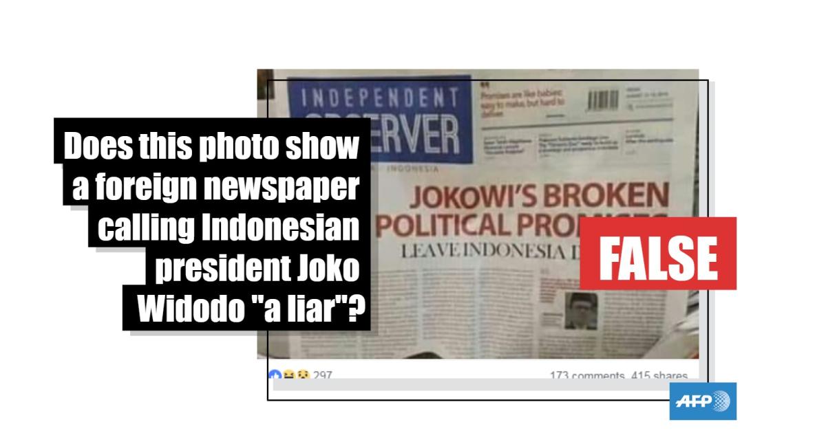 No, this photo does not show a foreign newspaper calling Indonesian president Joko Widodo “a liar”
