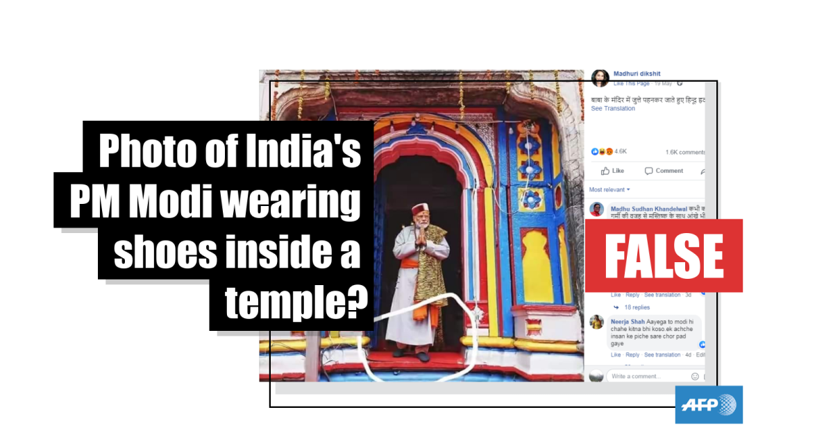 The claim is false. A careful examination of photographs published by Indian media and posted on Prime Minister Mod’s official Twitter page here and website here, show that Modi was wearing socks not shoes inside the temple.