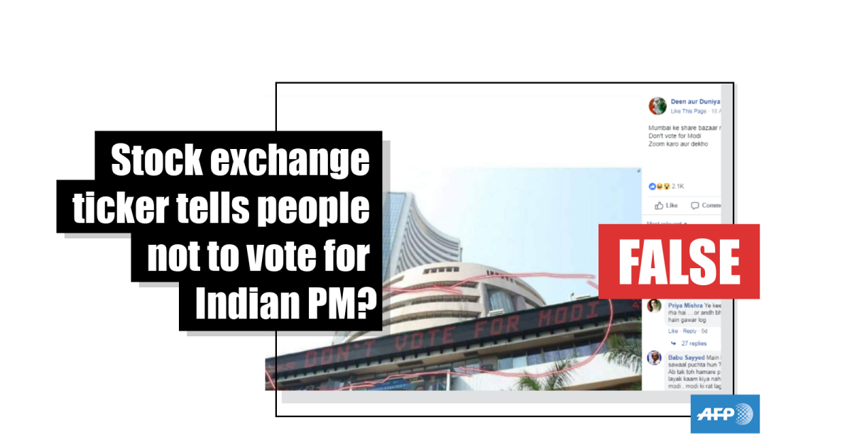 The posts, for example this one published April 18, 2019, and shared more than 15,000 times since, contain the image showing the Bombay Stock Exchange in Mumbai. Here is the bourse’s website.
