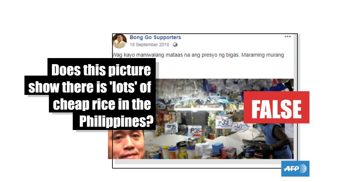 The photograph, which was posted here on September 18, 2018, and has been shared nearly 200 times, shows rice on sale for between 35-42 peso (67-80 US cents) a kilo.