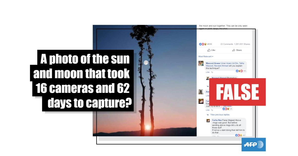 This Facebook post, which has been shared more than one million times, says: “A German photographer had fixed 16 cameras to get this shot for which he had to wait for 62 days. See the moon and sun together. This can be only seen again in 2035. Enjoy the shot.”